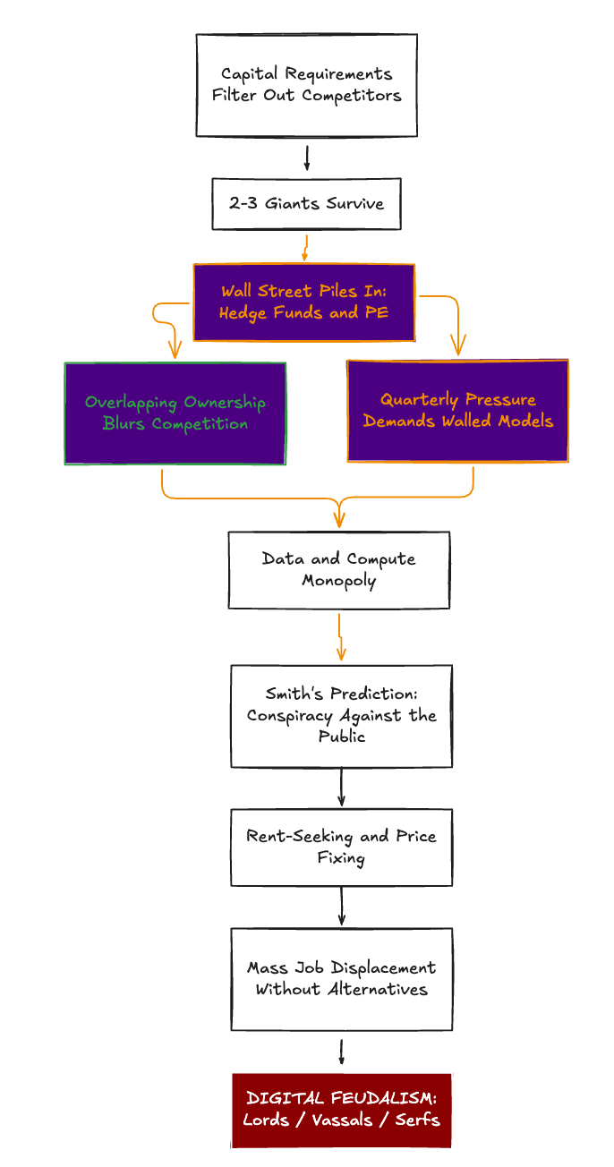 As much as I want to an optimists and frame this as a choice. One road leads to dystopia, the other to a democratic AI paradise. Pick the right path, and we are fine. In reality,there is no fork. Unregulated markets in capital-intensive industries do not branch. They consolidate. Always. The natural gravity of the system pulls everything toward a single point.