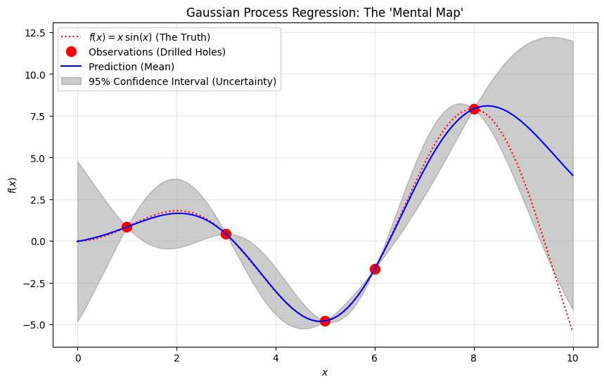 The Surrogate Model (The Map): After every drill, you update your sketch of the terrain. If you found gold in one spot, you guess there might be more nearby. If you found nothing, you assume that area is barren. This sketch gives you a probability of finding gold across the map.