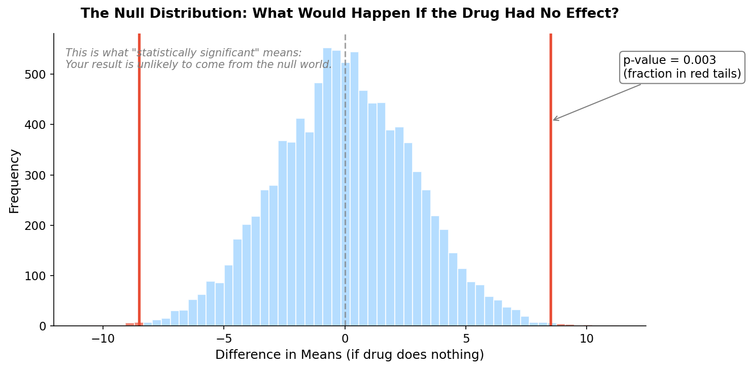 No formulas. No t-tables. Just direct simulation of what would happen if the drug did nothing.
