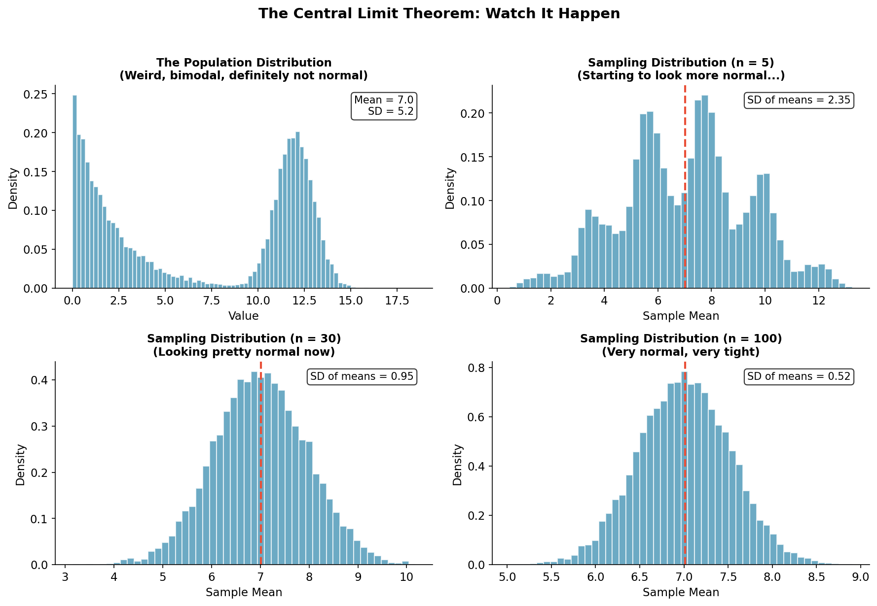 The Central Limit Theorem is not a formula to memorize. It is something you can watch happen. The averaging process smooths out the weirdness. Larger samples smooth more. The standard deviation of the sampling distribution shrinks from 2.35 to 0.95 to 0.52, roughly following \(1/\sqrt{n}\)
