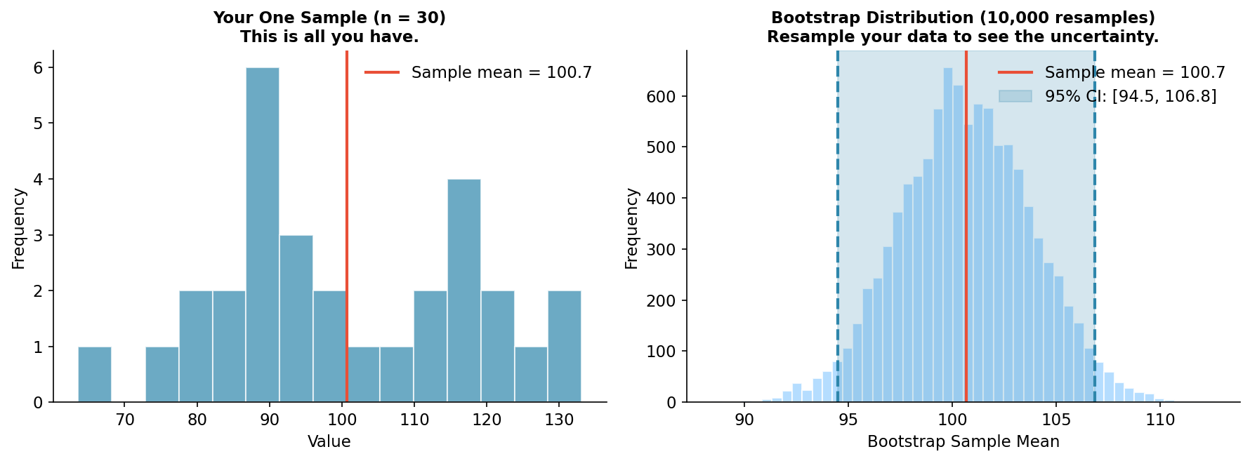 On the left is your one sample of 30 observations. This is all you have. On the right is what happens when you resample from it 10,000 times. The spread of those bootstrap means gives you the confidence interval directly. The middle 95% spans from 94.5 to 106.8.
