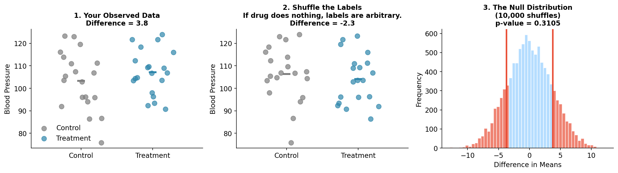 In this case, a p-value of 0.31 means my result is not unusual under the null hypothesis. I cannot reject the possibility that the drug does nothing. The permutation test made that clear by showing me exactly what “nothing” looks like.
