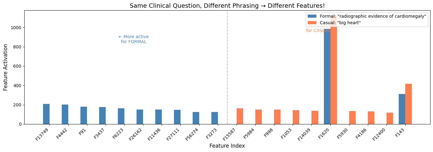 Some features only fire for formal clinical language. Others only fire for casual phrasing. The model has learned distinct representations for how questions are asked, not just what they’re asking.
