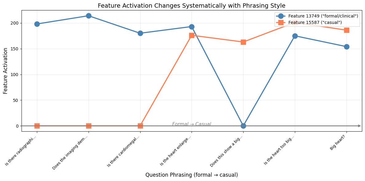 The pattern was clear. As the phrasing got more casual, Feature 13749 dropped and Feature 15587 rose. The crossover happened right around “Is the heart enlarged?” in the middle of the spectrum.This has real implications for medical VLM safety.A radiologist using formal clinical terminology might get a different answer than a patient asking the same question casually. The underlying clinical content is identical. But the model routes it through different internal circuits.