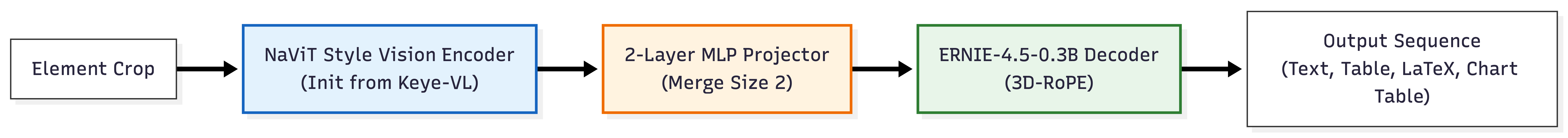 The projector is a randomly initialized 2 layer MLP with GELU, using a merge size of 2 to bridge vision features into the language embedding space efficiently.In plain terms: reduce the token burden before the decoder pays attention to everything.Autoregressive decoding cost is tied to decoder size. The paper explicitly chooses ERNIE-4.5-0.3B for inference efficiency and adds 3D-RoPE for positional representation.The element recognizer is also built via post adaptation using pretrained weights: Keye-VL for the vision side and ERNIE-4.5-0.3B for the language side.
