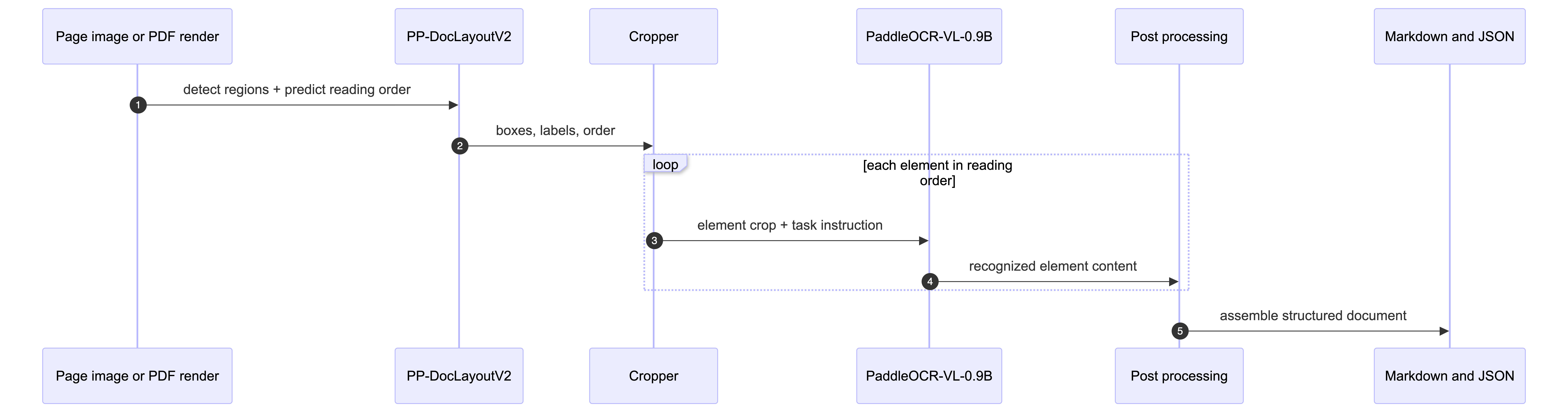 After layout and element recognition, PaddleOCR-VL runs a lightweight post processing module that aggregates outputs from both stages and formats the final result into structured Markdown and JSON.
